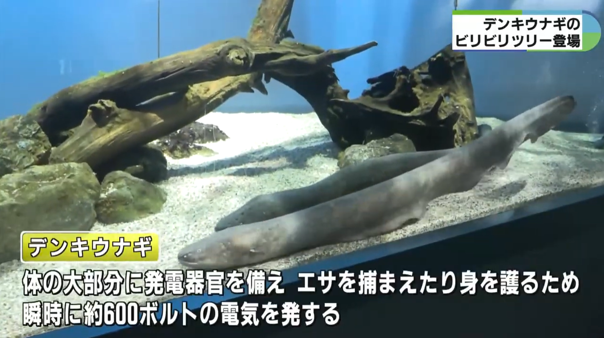 デンキウナギは、体の大部分に発電器官を備えていて、エサを捕まえたり身を護るために瞬時に約600ボルトの電気を発することができます。